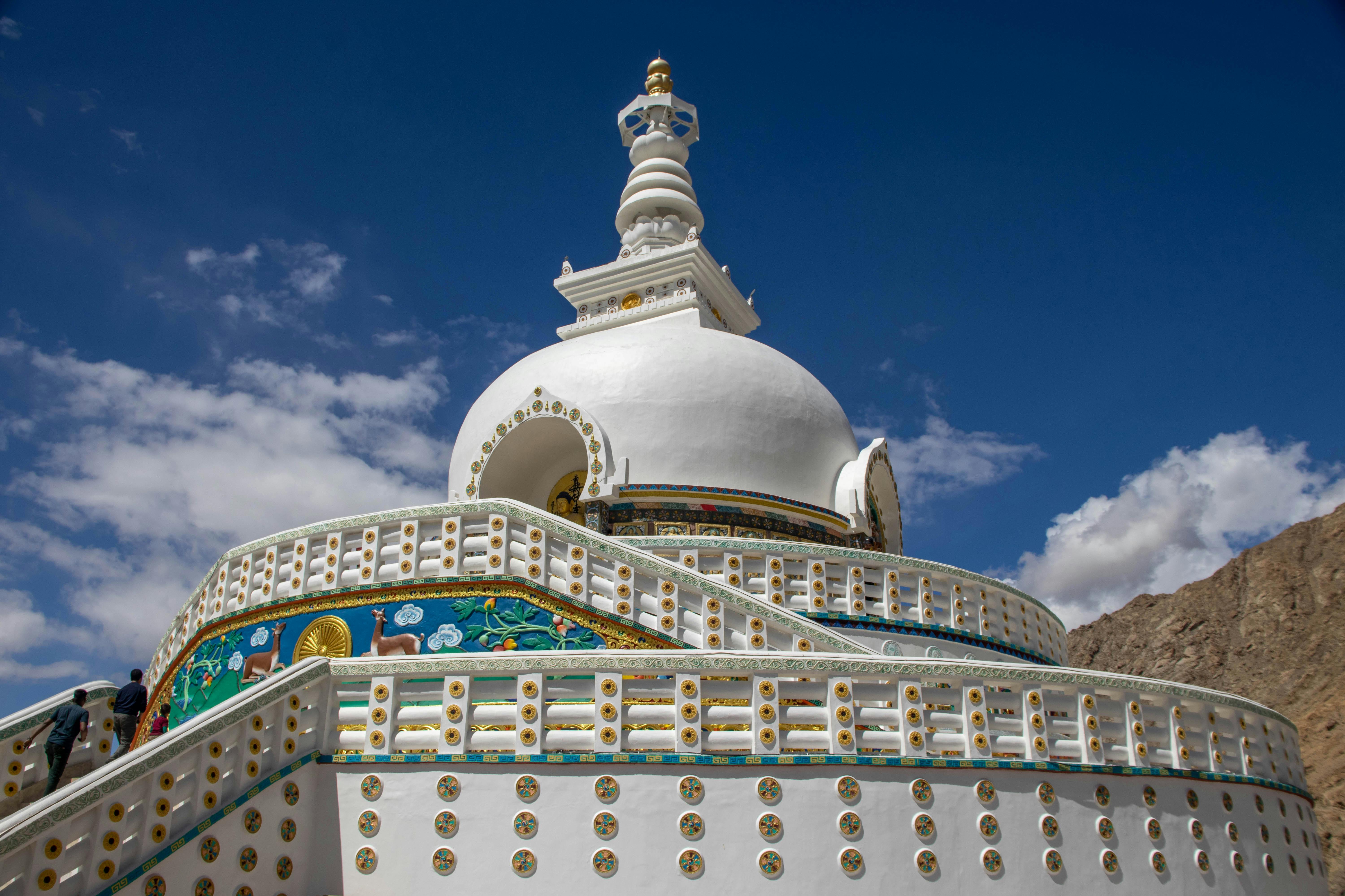 The Shanti Stupa is located on an elevated area in Changspa. This all-white Buddhist structure represents tranquillity and is a prominent attraction in Leh. Constructed in 1991 by Gyomyo Nakamura, accompanied by local Buddhists, and built to house Buddha's relics, the stupa is a sacred site, with its two beautiful tiers being particularly impressive.
